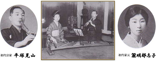 麗明都志子 (1905〜1974) Toshiko Reimei, the first head master 初代家元麗明都志子は、幼少jの頃東京で初代米川親敏に師事、又筝曲界の巨匠宮城道雄の第一回作曲講習を受け、久本玄智にも直接指導を受く。都志子の演奏する新曲及び古典は放送、公演を通して広く世に知られ、また門下生の養成にも勤める。昭和11年初代平塚晃山と麗明都志子ほかでレコード吹込「六段の調」「千鳥の曲」など絶賛を博す。 |